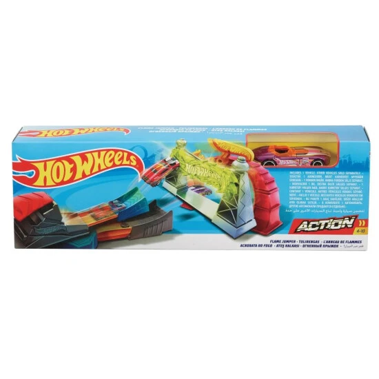 Die einzigartige Form lässt Autos mit schwindelerregender Geschwindigkeit über die Strecke huschen und durch den brennenden Reifen springen. Dieses coole Set an Herausforderungen bietet Anfänger und Fortgeschrittenen non-stop Spaß!