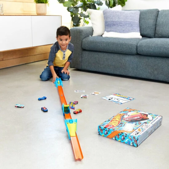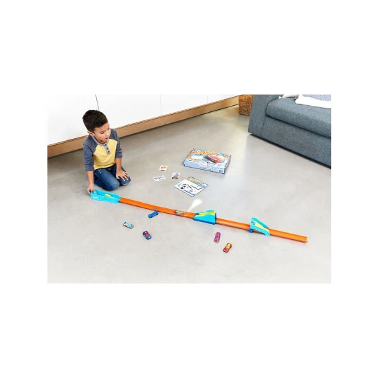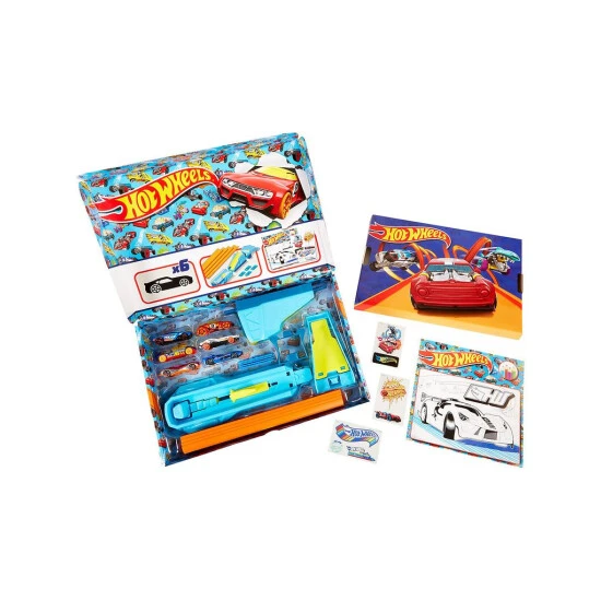 Eine Schachtel mit maximaler Überraschung! Zu den 6 mitgelieferten Hot Wheels-Fahrzeugen gehört eine Vielzahl von Zubehörteilen.