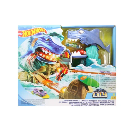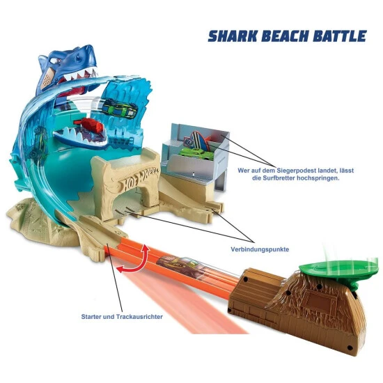 ?Die Fantasie der Kinder ist gefragt, als ein riesiger Hai Hot Wheels City angreift und den Hot-Wheels-Surf-Wettbewerb bedroht! Die Autos weichen auf ihrem Weg durch die Wellen, um dadurch den Hai und seinen Zähnen auszuweichen Oh oh, er hat sich das Auto geschnappt! Da muss schnell ein anderes Auto zur Rettung gestartet werden Einfach zielen und in den Hai schleudern, um ihn zu besiegen Ist der Hai besiegt, bricht die Welle dramatisch zurück und die Fahrzeuge kommen frei! Mit seinen tollen Funktionen ist dieses große Strand-Spielset perfekt für stundenlanges Geschichtenerzählen Punkte im Surf-Wettbewerb gibt es für gekonntes Wellenreiten und Landungen auf der Tribüne! Hot Wheels City lässt sich individuell mit anderen City-Spielsets kombinieren Die City-Spielsets sind außerdem kompatibel mit orangenen Tracks und weiteren Spielsets Enthält einen Starter im Stil einer Tiki-Hütte und ein Hot-Wheels-Fahrzeug ??