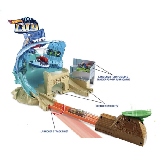 Un juguete de grandes dimensiones ambientado en una playa donde hay un amenazante tiburón que come cochesEl desafío de salvar la ciudad de Hot Wheels estimulará la imaginación de los niños y dará pie a muchas historiasPara derrotar al tiburón, deberán lanzar un coche y hacerlo chocar contra sus mandíbulasJuguete fácil de reiniciar y sin piezas sueltas; Funciona magistralmenteSe puede conectar con otras pistas Hot Wheels City para crear una ciudad Hot Wheels a medida; Las nuevas pistas Hot Wheels City también son compatibles con las naranjas y las de otras colecciones. Seguridad del producto: Este producto está sujeto a instrucciones y advertencias específicas de seguridad. Advertencia: No apto para niños menores de 36 meses. Advertencia: Sólo para uso doméstico. Advertencia: Utilícese bajo la vigilancia directa de un adulto. Por favor lea las recomendaciones del fabricante.