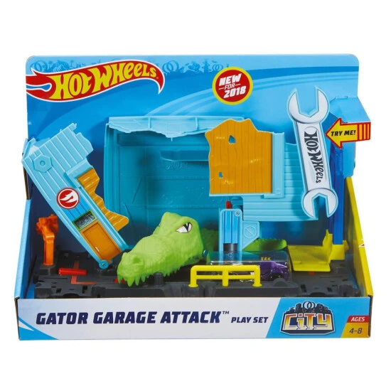 Jedes spannende Set lädt die Kinder zum Nachspielen heldenhafter Herausforderungen ein um ihre Stadt zu verteidigen. Mit ihren Hot-Wheels-Fahrzeugen können die Kinder an Wettbewerben teilnehmen und großartige Stunts hinlegen. Beim Kroko-Angriff Werkstattset muss das Krokodil besiegt werden, doch im verlassenen Haus lauert noch eine Fledermaus und die schaukelnde Spinne im Park, ist eine ganz besondere Herausforderung! Jedes dieser drei „Hot Wheels City“-Sets lässt sich mit anderen „Hot Wheels City“-Sets verbinden und ist außerdem mit den orangefarbenen Tracks kompatibel. Enthält ein Hot-Wheels-Fahrzeug.