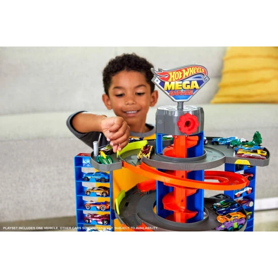 Das Hot Wheels City Power-Parkgarage Spielset bietet vier Ebenen voller Spielspaß. Es kommt mit einem Fahrzeug im Maßstab 1:64 und bietet Platz für 60 weitere Fahrzeuge (separat erhältlich). Im Zentrum ist ein spiralförmiger Aufzug, der die Fahrzeuge zu den verschiedenen Ebenen fährt und sie auf den Track los lässt. Kinder können ihn mit einer Kurbel steuern und die Fahrzeuge Wettrennen fahren lassen oder sie zum Ausstellen auf eine der Ebenen parken. Durch mehrere Verbindungspunkte an der Basis können Kinder das Spielset mit anderen Hot Wheels Spielsets (separat erhältlich) und durch weitere vier Verbindungspunkte mit orangefarbenen Trackteilen verbinden. Mit dem enthaltenen Hot Wheels Fahrzeug im Maßstab 1:64 kann der Spielspaß sofort beginnen. Abweichungen in Farbe und Gestaltung vorbehalten.