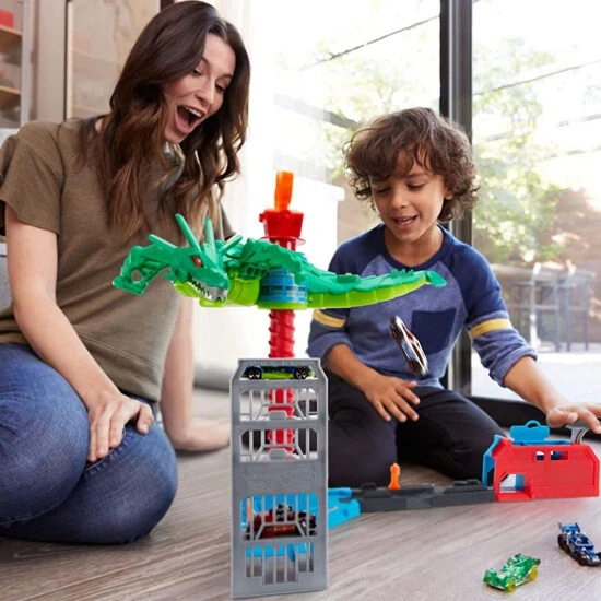 - Los más pequeños pueden lanzar los coches Hot Wheels a escala 1:64 mientras el dragón robótico está en movimiento para intentar golpear su fuente de energía y derribarlo.