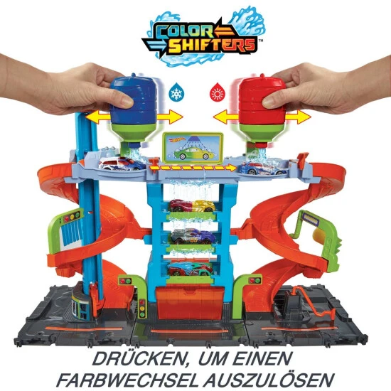 Mit der Hot Wheels City Mega Autowaschanlage macht sogar das Putzen Spaß! In die Turm-Autowaschanlage fahren, den Hebel zurückziehen und schon bewegt sich das Auto auf der sich drehenden Spirale nach oben. Ganz oben befinden sich zwei Wassertanks, die heißes und kaltes Wasser auf die im Lieferumfang enthaltenen Color Shifters-Fahrzeuge spritzen. So verändern diese wie durch Zauberhand ihre Farbe. Die praktischen Wasserwannen fangen das abtropfende Wasser auf, während die Auto durch den Rest der Anlage fahren. So kommt es zu keiner Überschwemmung! Die Mega-Autowaschanlage lässt sich mit anderen Sets verbinden. So kann ganz einfach eine eigene Hot Wheels Stadt gebaut werden. Alle Artikel separat erhältlich. Abweichungen in Farbe und Gestaltung vorbehalten.