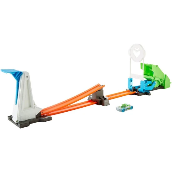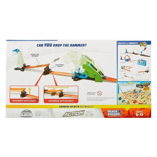 Bei diesem coolen Stunt Builder Set lässt man ein Fahrzeug von einer Rampe gegen einen Hammer fliegen, der herunterklappt, damit das Fahrzeug zum Sieg rasen kann. Die bewegliche Rampe und weitere Teile, die sich unterschiedlich anbringen lassen, sorgen für weitere Herausforderungen und Spielmöglichkeiten. Lässt sich mit anderen Sets oder Teilen der Stunt Builder Welt verbinden. Ein Hot-Wheels-Fahrzeug enthalten.