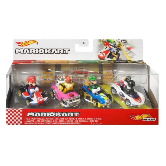 - Hot Wheels präsentiert in Zusammenarbeit mit dem legendären Videospiel Mario Kart das 4er-Pack mit Mario Kart Die-Cast-Fahrzeugen im Maßstab 1:64!