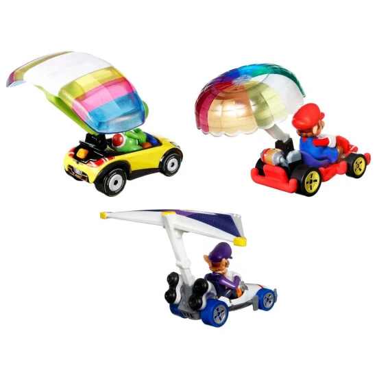 Dieser Pack enthält drei Mario Kart Hot Wheels Diecast Fahrzeuge im Maßstab 1:64.Mit dabei sind:- Yoshi (Sports Coupe + Parafoil Glider)- Waluigi (B-Dasher + Super Glider)- Mario (Pipe Frame + Parachute Glider)Hinweis: Verpackungs-Abbildungen dienen lediglich als Beispiel und können in puncto Design oder Sprachvariante von der tatsächlichen Verpackung abweichen.