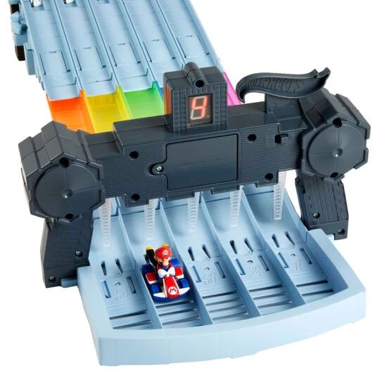 Mit der absolut ikonischen letzten Strecke der Reihe, der Mario Kart Regenbogen-Boulevard, erwecken Hot Wheels and Mario Kart ein spannendes Videospiel-Level zum Leben! Der ca. 2,5 Meter lange Track bietet fünf durchscheinende Rennbahnen in Regenbogenfarben, die gerade oder mit Kurven konfiguriert werden können. Kinder können die elektronische Schranke für faire Starts verwenden, um bis zu fünf ihrer liebsten Mario Kart Die-Cast-Karts im Maßstab 1:64 ins Rennen zu schicken. Das Trackset wird mit zwei Fahrzeugen geliefert: einem exklusiven King Boo und Mario. Sobald die Karts im Rennen sind, können sie auf Wandkurven oder eine wellige Strecke treffen und müssen den Itembox-Randomizer passieren, um zu gewinnen! Der Sieger wird am Ziel mit Lichtern und Geräuschen verkündet. Ein tolles Geschenk für Kinder ab 4 Jahren – besonders für Fans von Mario Kart! Abweichungen in Farbe und Gestaltung vorbehalten.