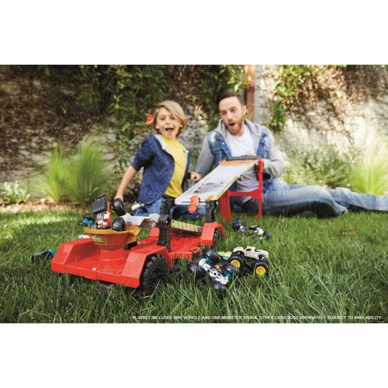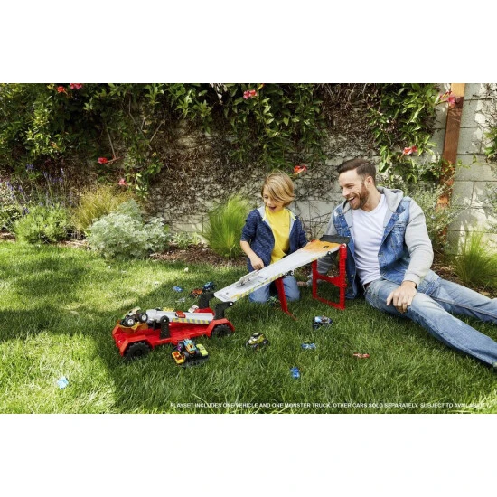 Dieses Monster Truck Spielset kann mehr als jedes andere! Das Hot Wheels Monster Truck Abwärtsrampe-Spielset ist Schauplatz für das ultimative Wettrennen zwischen Hot Wheels Monster Trucks und Hot Wheels Autos. Wer am schnellsten alle Hindernisse aus dem Weg räumt, ist zuerst im Pokal! Dann stürzt die Crash-Rampe ab und die Konkurrenz lernt fliegen! Das Set ist zugleich ein Monster Truck-Transporter. Im Transporter-Modus wird ein Monster Truck im Maßstab 1:64 vorn angekoppelt, und ab geht die Fahrt! Das Set enthält einen Hot Wheels Monster Truck und ein Hot Wheels Auto. Fans von Hot Wheels und Monster Trucks erwartet bei der Abfahrt ein Riesen-Rennspaß!