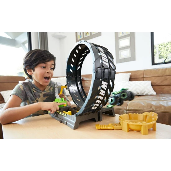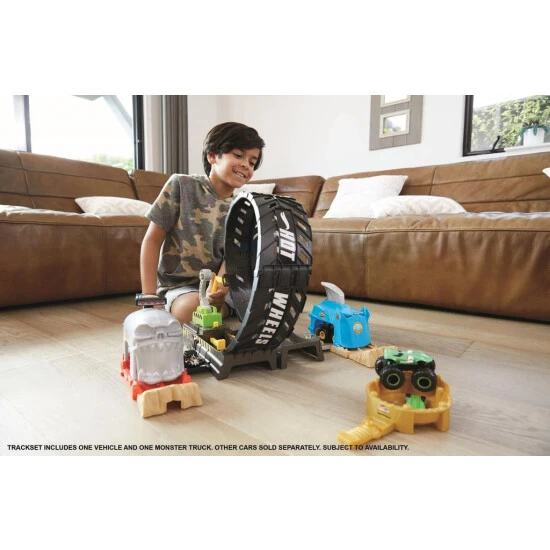 Las enormes ruedas, que son la marca característica de los monster trucks de hot wheels, han servido de inspiración a este original concepto de looping con diseño de llantas y un toque acrobático que encantará a los niños