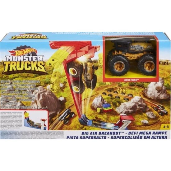 Mit dem Hot Wheels Monster Trucks Mega Sprung-Blaster Spielset können Kinder unter Beweis stellen, wie hoch sie ihre Trucks auf dem vertikalen Track in die Luft katapultieren können! Die Box enthält ein komplettes Spielset mit 4 Fahrzeugen und den Hot Wheels Loco Punk Die-Cast-Truck im Maßstab 1:64 mit seinen riesigen Rädern! Auf den Starter hauen und den Loco Punk-Truck wieder und wieder vertikal in die Höhe schießen lassen. Wie hoch kann der Truck fliegen? Kinder können gegen Freunde antreten oder den Truck selbst in die Luft katapultieren. Ein tolles Geschenk für Kinder im Alter von 3–6 Jahren.