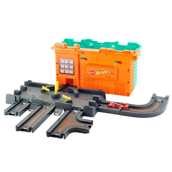Kinder können mit ihren Hot Wheels-Fahrzeugen durch die Stadt rasen! Dieses Set kann auf vielfältige Weise bespielt werden, beginnend mit dem Eingang zum Hauptgebäude, der von zwei verschiedenen Seiten zugänglich ist. Die Kinder haben die Möglichkeit, ihre Autos in der Werkstatt zu “reparieren” und sie anschließend auf dem Kreisverkehr zu testen. Erinnern Sie sie daran, auf die “Signale” zu achten! Sie können in ein Gebäude fahren, sich durch einen Tunnel schleichen und Autos in geheimen Verstecken lagern! Einzigartige Streckenteile ermöglichen es Ihnen, jedes Mal eine neue Route zu erstellen. Wenn es an der Zeit ist, nach dem Spaß aufzuräumen, wird einfach alles in das Gebäude gestellt und mit dem Deckel des Karussells abgedeckt – so lässt es sich leicht aufbewahren, bis das nächste Abenteuer ansteht! Jedes Set ist mit anderen Hot Wheels City-Sets, Hot Wheels City grauen Schienen und Hot Wheels City orangen Schienen kompatibel. Ein Auto inklusive.