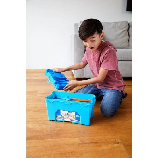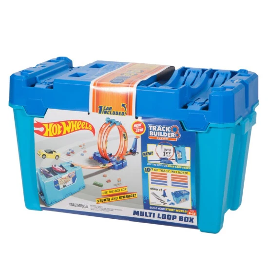 Mit den zahlreichen Teilen in dieser fantastischen Box kann eine gigantische Track-Builder-Welt erbaut werden Perfekt für endlos lange Stunts, Experimente und individuelle Anpassungen Mit ca 3 m Trackteilen, Verbindungsstücken, Starter, Hot-Wheels-Fahrzeug und einer Stunt-Box Nichts geht über die durchgedrehten Loops, die sich damit bauen lassen! Auch der Deckel und der Behälter können in den Track integriert werden und kommen dort ganz groß raus! Am Deckel gibt es acht Stellen, um ein Trackteil anzustecken, und in der Unterseite des Behälters sind zwei eingebaute Punktebehälter sowie eine Ansteckmöglichkeit für ein Trackteil Zu den zahllosen, immer wieder neu konfigurierbaren Varianten, die zu meistern sind, gehören auch der Mega-Looping-Stunt, die Doppel-Looping-Challenge und der Loop-and-Launch-Showdown – eine „Looping-Bauanleitung“ ist ebenfalls enthalten, um die Kreativität anzutreiben Beim dem Track Builder geht es darum, zu experimentieren und sich dabei zu entwickeln, eine Problemlösungskompetenz zu erschaffen und sich dem Wettbewerb zu stellen! Die Box dient gleichzeitig als Aufbewahrungslösung und lässt sich unterwegs mitnehmen! Auf dem Deckel können dank der Vorrichtungen mit Bausteinen fantasievolle Werke entstehen! Viele Komponenten in der Multi-Looping-Box haben mehr als einen Verwendungszweck, damit Kinder ihrer Fantasie – und ihren Tracks – mit einer Reihe nahezu endloser Konfigurationen, freien Lauf lassen können Lässt sich mit anderen Sets und Tracks verbinden Auch gewöhnliche Haushaltsgegenstände wie Trinkbecher, Pappröhren, Bücher und vieles mehr lassen sich verbauen Herausforderung angenommen!