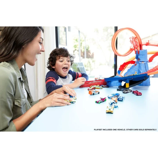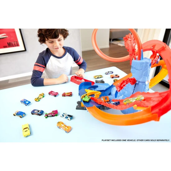 ?Das „Hot Wheels Vulkanflucht“-Trackset ist ein interaktives Set für kontinuierliches Spiel mit mehreren Autos
